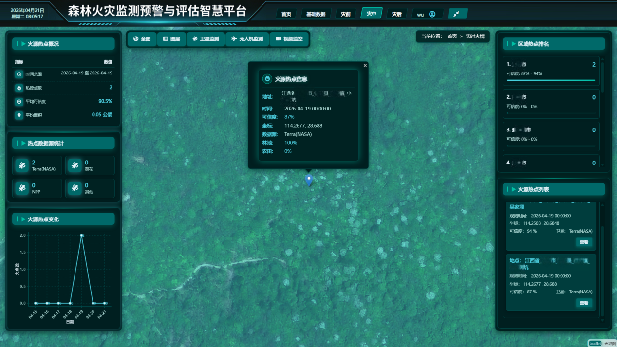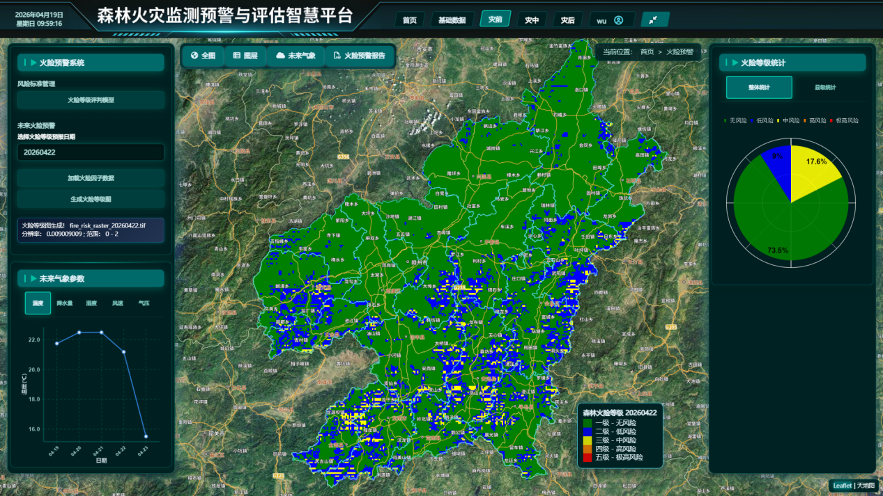 基于气象数据与历史火灾信息,平台构建了火险分析模型,可对不同区域的火险状况进行评估。系统支持生成火险预警信息,为防火部门的防控工作提供参考,帮助合理安排巡查与防范力量。