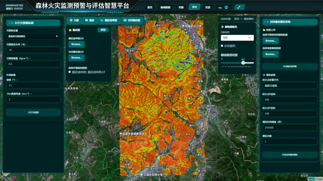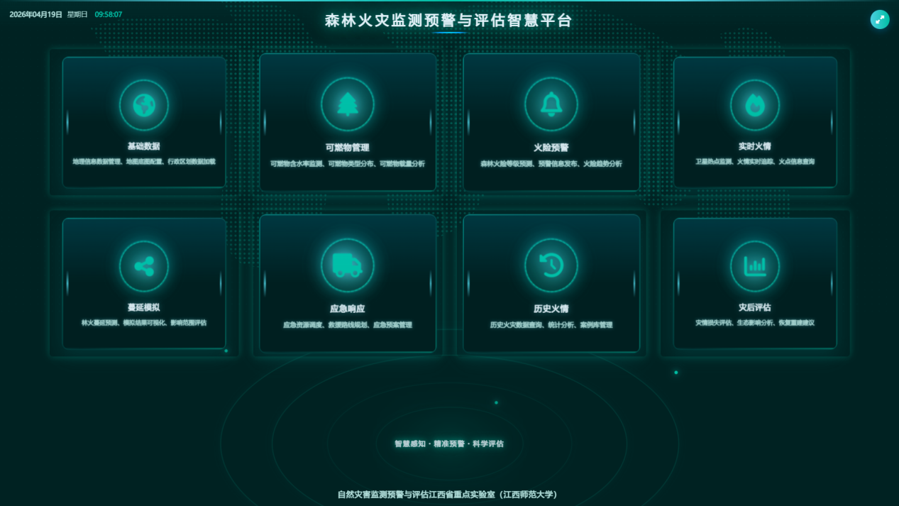 近日,“自然灾害监测预警与评估江西省重点实验室”森林火灾团队完成"森林火灾监测预警与评估智慧平台"v1.0版本的研发。平台包括“基础数据”、“可燃物管理”、“火险预警”、“实时火情”、“蔓延模拟”、“应急响应”、“历史火情”、“灾后评估”等功能模块。该平台注重技术与实际需求的结合,采用模块化设计,便于与现有防火管理系统对接。